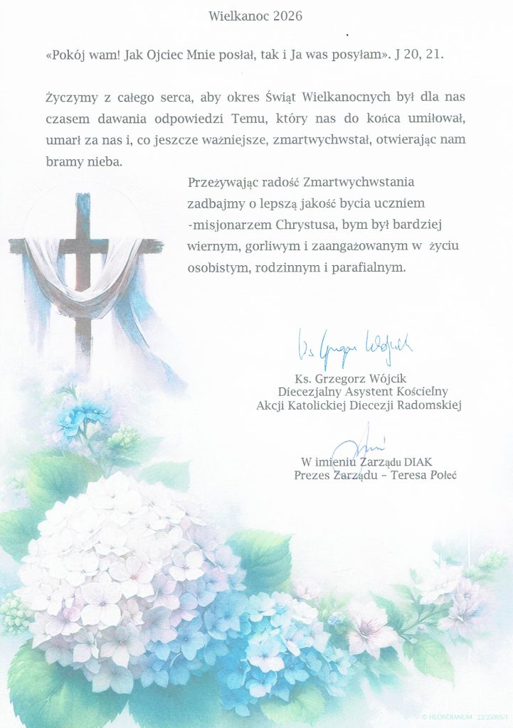 Życzymy z całego serca, aby okres świąt Wielkanocnych był dla nas czasem dawania odpowiedzi Temu, który nas do końca umiłował, umarł za nas i, co jeszcze ważniejsze, zmartwychwstał, otwierając nam bramy nieba.